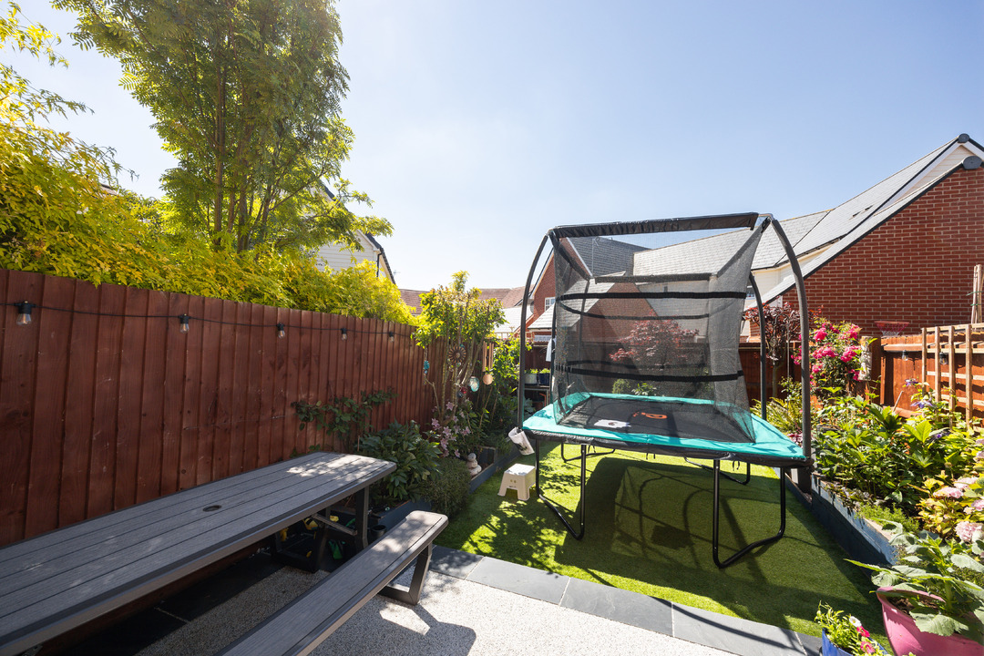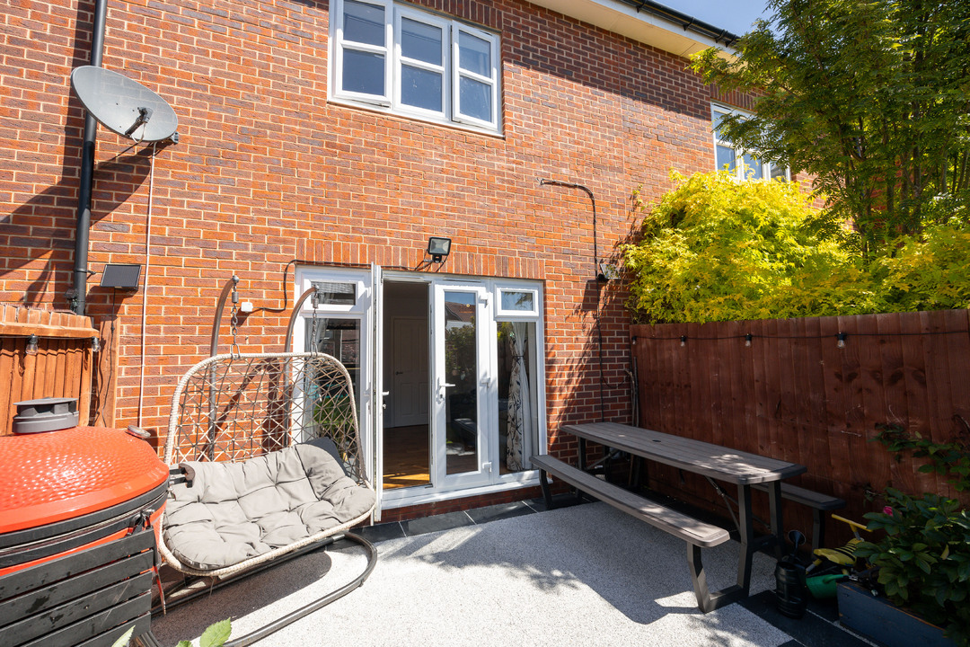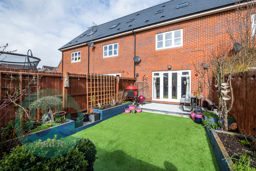 The south facing rear garden is mainly laid to artificial lawn for ease of maintenance, raised planters, resin bound patio area, small decked area, enclosed by timber panel fencing, rear gate leading to garage.