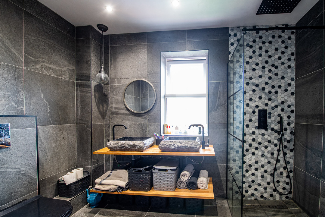 A modern, refitted bathroom is located on the first floor comprising walk in double shower, his and her wash hand basin situated in a vanity unit, low level WC.